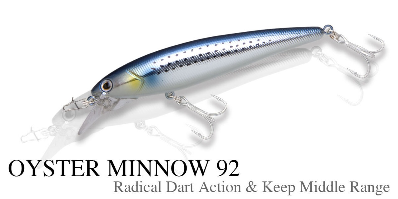 バス用ジャークベイトとして開発されながら、発売直後からシーバスにも抜群の威力を発揮した「レイダウンミノーミッド」。その特徴をさらにシーバスに特化させるべくチューニングを施したのが「オイスターミノー92」。やや太目のボディが生み出す強い浮力、キレのあるアクションを低重心固定ウエイトで制御する事で、強く水を掴みながらもローリング系の派手すぎないシーバス好みのアクションを発生。その水押しが離れたシーバスにもその存在感をしっかりアピールし、同時にアングラーに明確な操作感を伝えます。固定重心で不利になる飛距離は、リップ裏面のキャスティングフィンによってフォローする事で高浮力と飛距離を両立。そして特徴的なのがジャーク時のダートと、その後のストップ。強く水を押しながらも軽快に左右へ首を振り、ストップさせるとその場でロールするようにボディを揺らし、バイトのタイミングを作り出します。比重も港湾部や河口付近での使用を前提に、汽水域で使いやすい“湾奥サスペンド”設定としています。数あるミノータイプの中でも、水押しの強さでシーバスを呼べるルアーは稀有な存在。誘い出して喰わせるゲームが思う存分楽しめます。