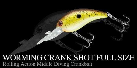 オリジナル「ショット」の実績充分なアクションと軽快なヒラ打ち、優れたカバークランキング性能をそのままに、キャスタビリティとアピール力、レスポンスをも向上したのが「フルサイズ」ボーンホワイト系ABS+空気室最大確保構造+タングステン&スチールウエイト、それらの相乗効果で高浮力なキレのあるアクションを生み出します。ボディと別素材のクリア系ABSリップによるスモールシルエットとともに、ABS成型だから可能なリップ裏面の”キャスティングフィン”が飛行姿勢を安定させキャスタビリティを向上します。そしてカラーと使うシチュエーションを考え合わせ、アピール系はラトル、ナチュラル系はサイレントと、カラーにサウンドを同調させた実戦的ラインナップとなっています。水深70cm~1.5mという、最もクランキングを多用する水深を手堅くカバーしていける、非常にオーソドックスなセッティングがクランキングの主軸を築きます。アシ際からリップラップ、消波ブロック、さらには点在するウィードクランプをストレスなく攻め続けられる、幅の広い使い勝手が最大の魅力です。